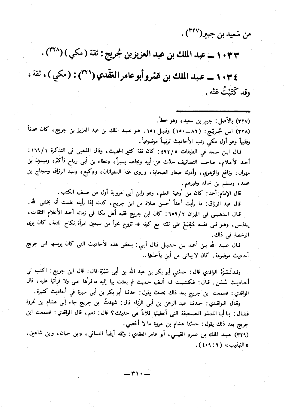 2 ابن جريج: "86-150" وقيل 151. هو عبد الملك بن عبد العزيز بن جريج، كان محدثًا وفقيهًا وهو أول مكي رتب الأحاديث ترتيبًا موضوعيًّا.