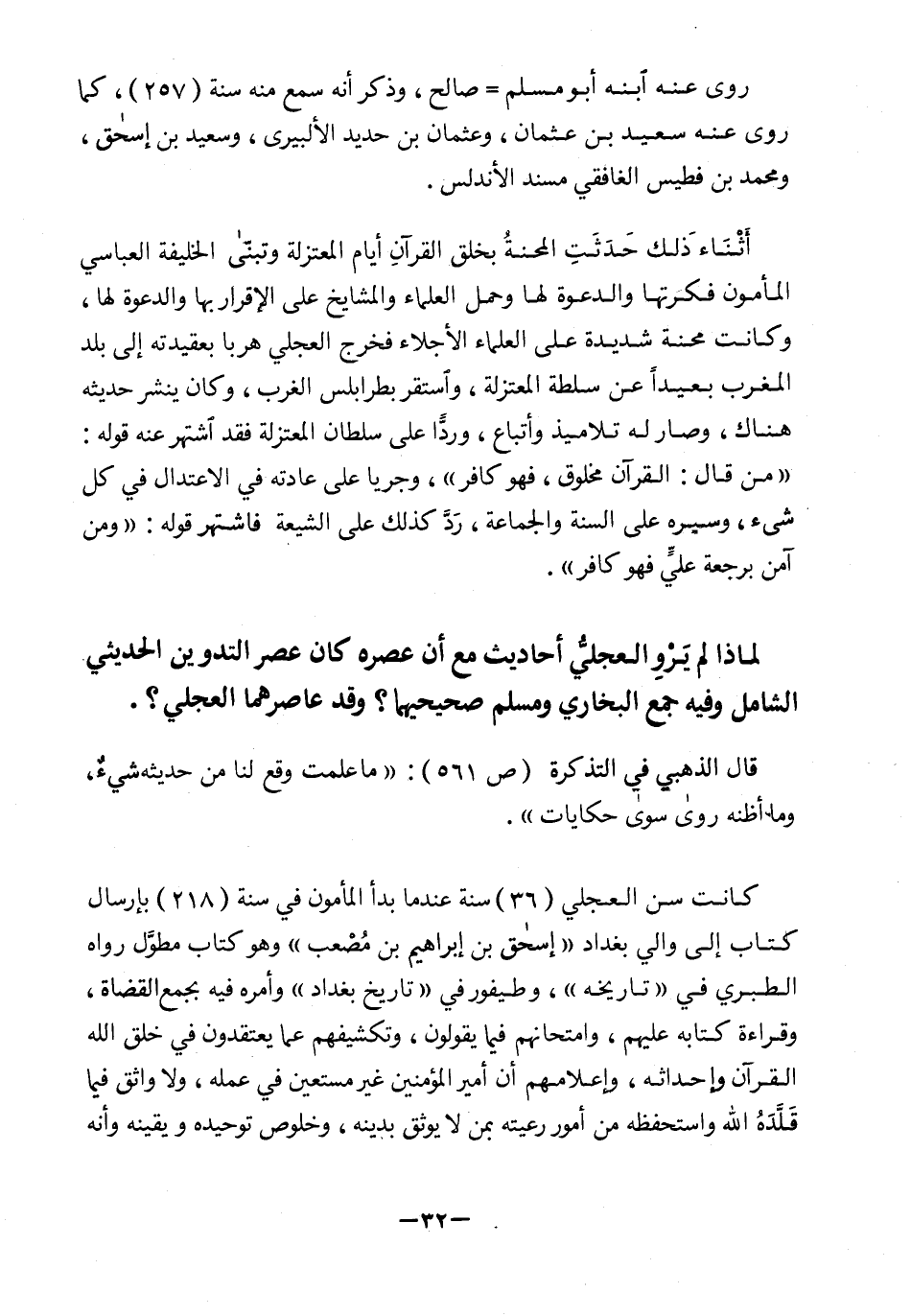 لا توحيد لمن لم يقر بأن القرآن مخلوق، ... ثم كتب إليه ثانيًا أن يرسل إليه سبعة من كبار المحدثين وهم: محمد بن سعد كاتب الواقدي، وأبو مسلم مستملي يزيد بن هارون، ويحيى بن معين، وزهير بن حرب "أبو خيثمة"، وإسماعيل بن داود، وإسماعيل بن أبي مسعود، وأحمد بن إبراهيم الدورقي، وهم في وجوه المحدثين في بغداد، وممن شنعوا على المأمون بالقول بخلق القرآن، ومن رؤوس الذين يقولون بقدمه.