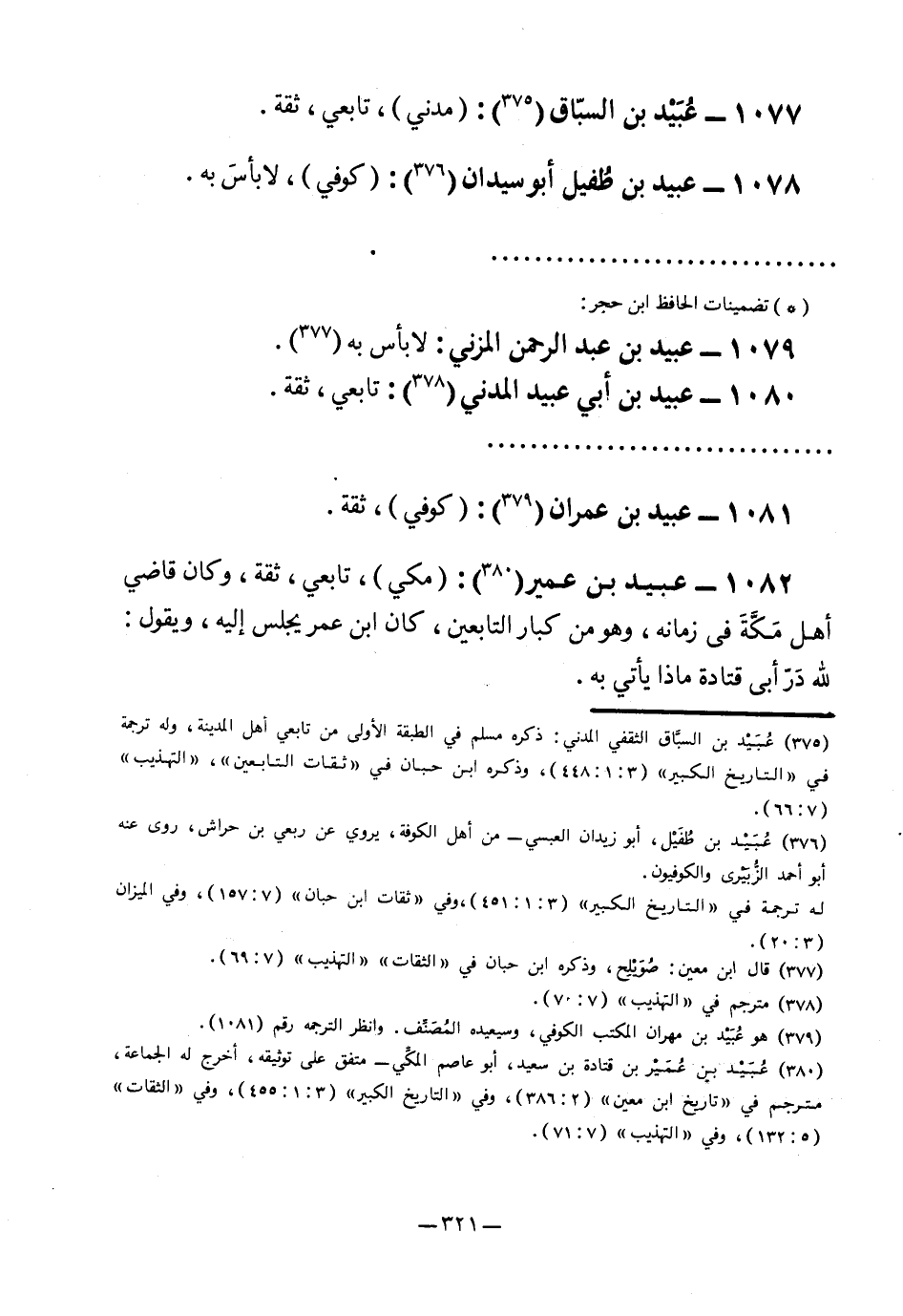 1082- عبيد بن عمير6: "مكي"، تابعي، ثقة، وكان قاضي أهل مكة في زمانه، وهو من كبار التابعين، كان ابن عمر يجلس إليه، ويقول: لله در أبي قتادة, ماذا يأتي به؟