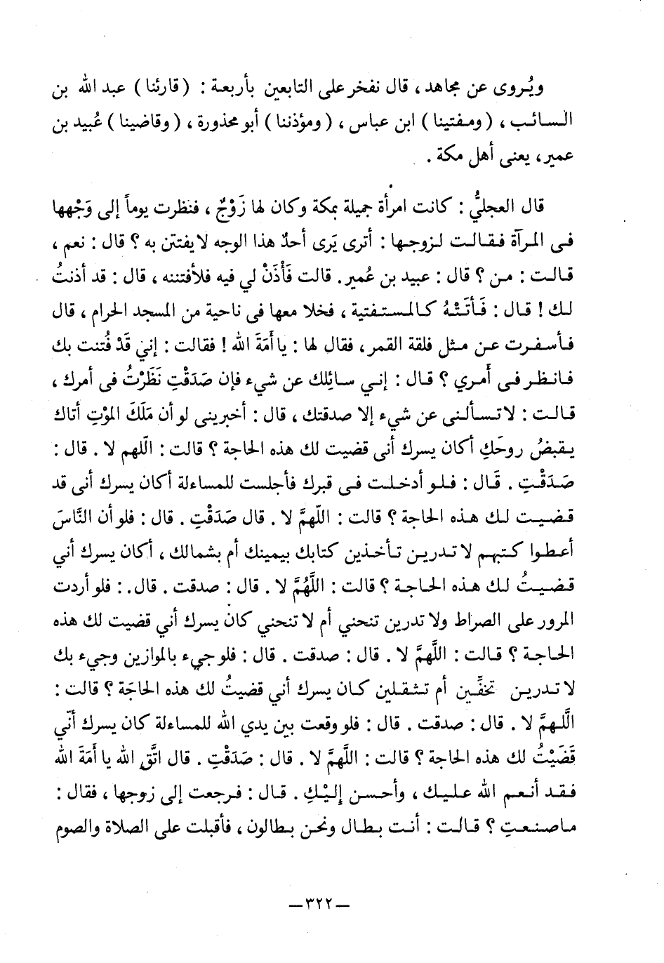 قال العجلي: كانت امرأة جميلة بمكة وكان لها زوج، فنظرت يومًا إلى وجهها في المرآة فقالت لزوجها: أترى يرى أحد هذا الوجه لا يفتن به؟ قال: نعم، قالت: من؟ قال: عبيد بن عمير، قالت فأذن لي فيه فلأفتننه، قال: قد أذنت لك! قال: فأتته كالمستفتية، فخلا معها في ناحية من المسجد الحرام، قال فأسفرت عن مثل فلقه القمر، فقال لها: يا أمة الله! فقالت: إني قد فتنت بك فانظر في أمري؟ قال: إني سائلك عن شيء فإن صدقت نظرت في أمرك، قالت: لا تسألني عن شيء إلا صدقتك، قال: أخبريني لو أن ملك الموت أتاك يقبض روحك أكان يسرك أني قضيت لك هذه الحاجة؟ قالت: اللهم لا. قال: صدقت. قال: فلو أدخلت في قبرك فأجلست للمساءلة أكان يسرك أنى قد قضيت لك هذه الحاجة؟ قالت: اللهم لا. قال صدقت. قال: فلو أن الناس أعطوا كتبهم لا تدرين تأخذين كتابك بيمينك أم بشمالك، أكان يسرك أني قضيت لك هذه الحاجة؟ قالت: اللهم لا. قال: صدقت قال: فلو أردت المرور على الصراط ولا تدرين تنحني أم لا تنحني كان يسرك أني قضيت لك هذه الحاجة؟ قالت: اللهم لا. قال: صدقت. قال: فلو جيء بالموازين وجيء بك لا تدرين تخفين أم تثقلين كان يسرك أني قضيت لك هذه الحاجة؟ قالت: اللهم لا. قال: صدقت. قال: فلو وقعت بين يدي الله للمساءلة كان يسرك أني قضيت لك هذه الحاجة؟ قالت: اللهم لا. قال: صدقت. قال اتق الله يا أمة الله فقد أنعم الله عليك، وأحسن إليك. قال: فرجعت إلى زوجها، فقال: ما صنعت؟ قالت: أنت بطال ونحن بطالون، فأقبلت على الصلاة والصوم