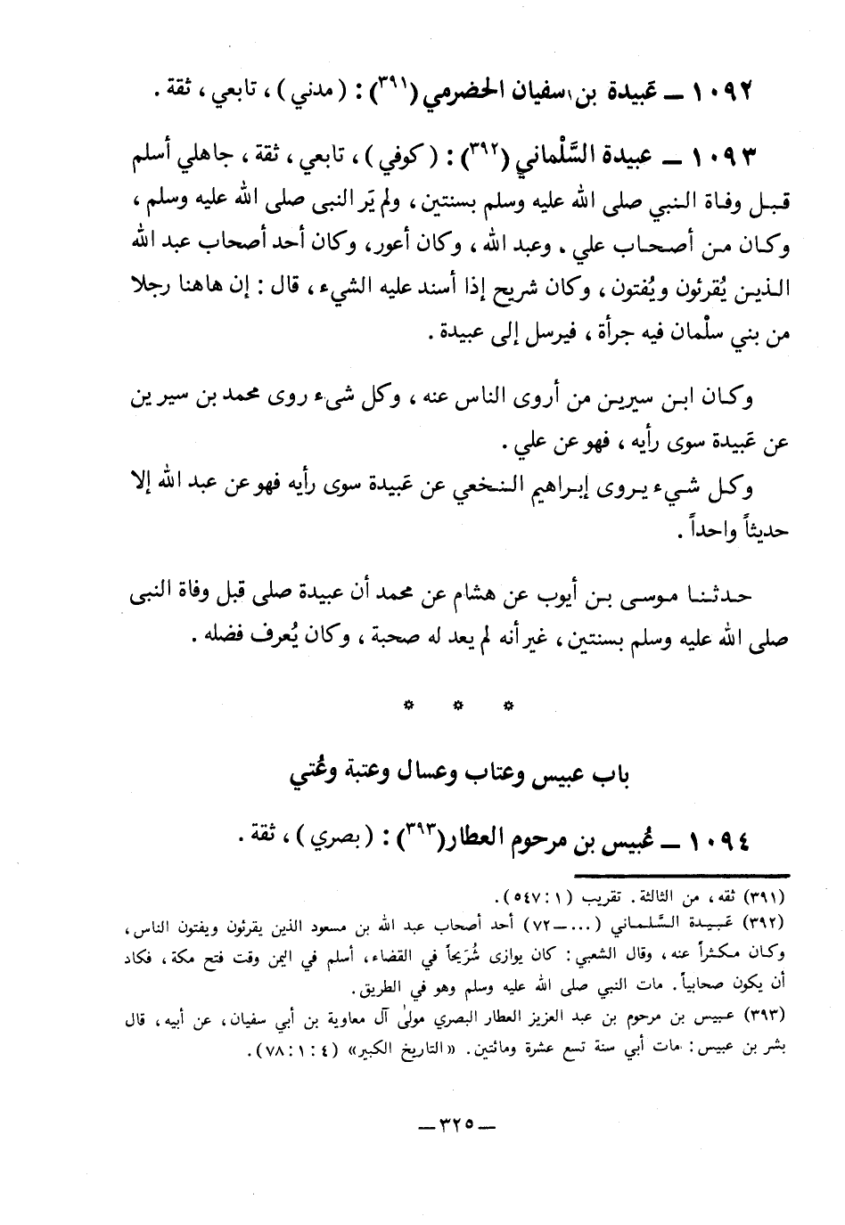 1093- عبيدة السلماني2: "كوفي"، تابعي، ثقة، جاهلي أسلم قبل وفاة النبي صلى الله عليه وسلم بسنتين، ولم ير النبي صلى الله عليه وسلم، وكان من أصحاب علي، وعبد الله، وكان أعور، وكان أحد أصحاب عبد الله الذين يقرئون ويفتون، وكان شريح إذا أسند عليه الشيء، قال: إن هاهنا رجلًا من بني سلمان فيه جرأة، فيرسل إلى عبيدة.