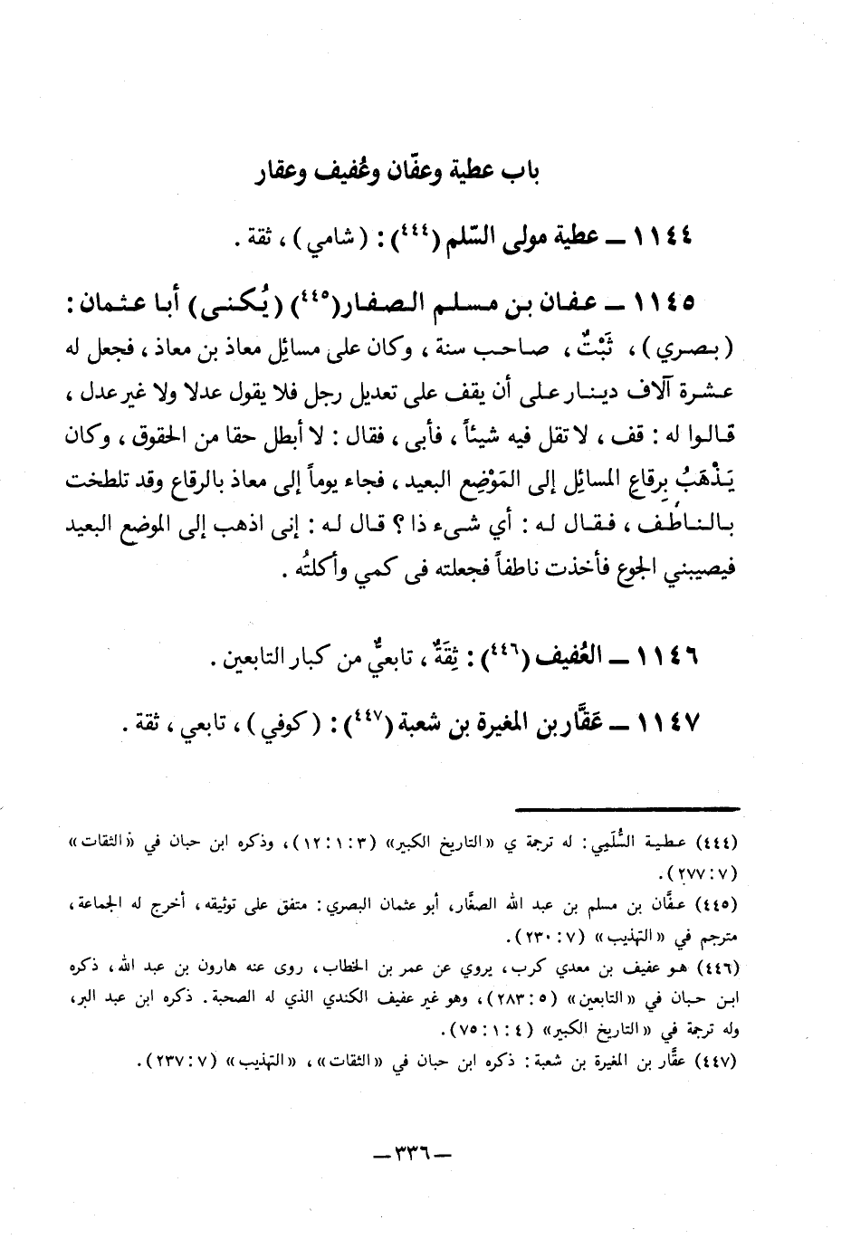 1145- عفان بن مسلم الصفار2 "يكنى" أبا عثمان: "بصري"، ثبت، صاحب سنة، وكان على مسائل معاذ بن معاذ، فجعل له عشرة آلاف دينار على أن يقف على تعديل رجل فلا يقول عدلا ولا غير عدل، قالوا له: قف، لا تقل فيه شيئًا، فأبى، فقال: لا أبطل حقًّا من الحقوق، وكان يذهب برقاع المسائل إلى الموضع البعيد، فجاء يومًا إلى معاذ بالرقاع وقد تلطخت بالناطف، فقال له: أي شيء ذا؟ قال له: إني أذهب إلى الموضع البعيد فيصيبني الجوع فأخذت ناطفًا فجعلته في كمي وأكلته.
