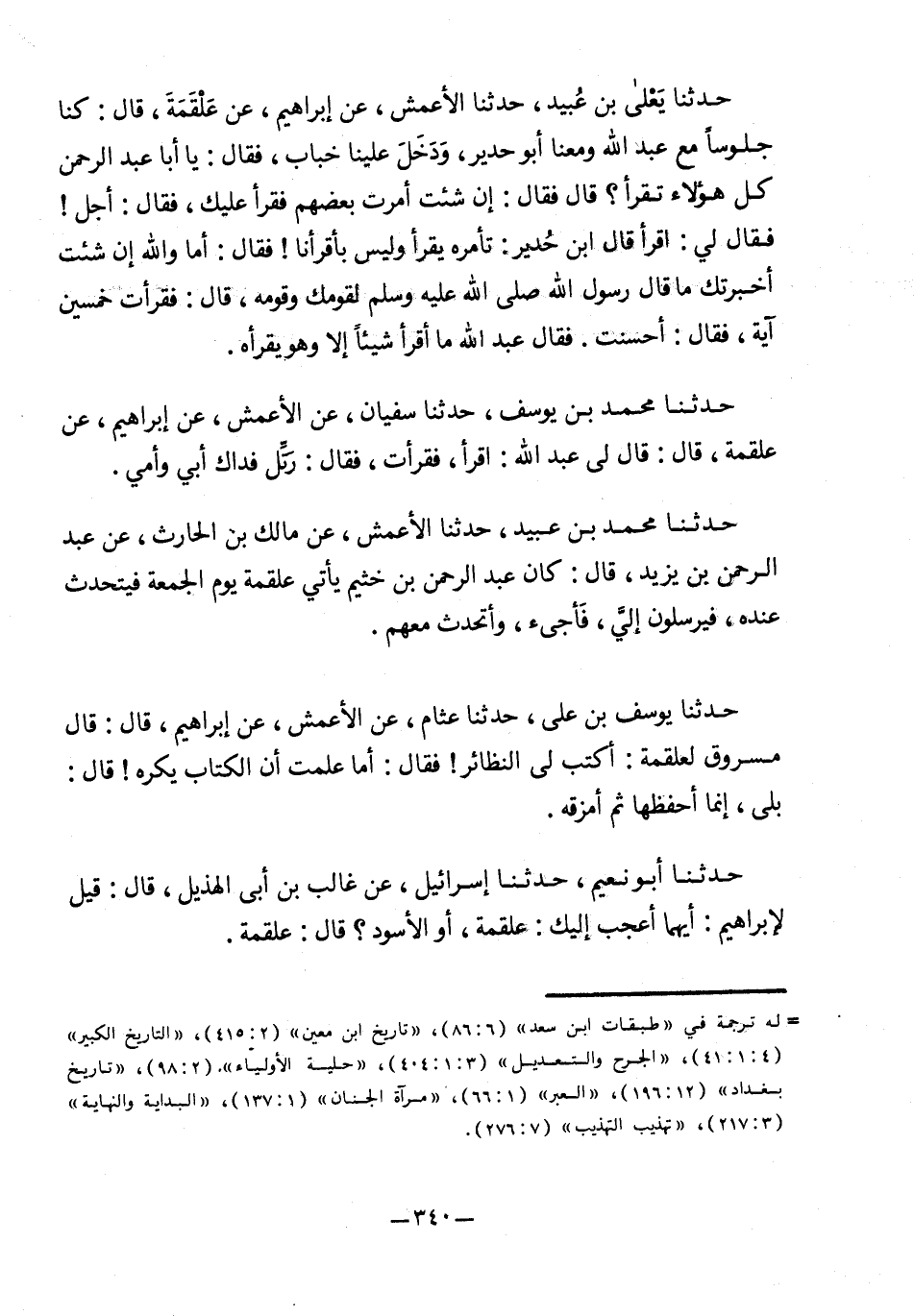 حدثنا يوسف بن علي، حدثنا عثام، عن الأعمش، عن إبراهيم، قال: قال: مسروق لعلقمة: اكتب لي النظائر! فقال: أما علمت أن الكتاب يكره! قال: بلى، إنما أحفظها ثم أمزقه.