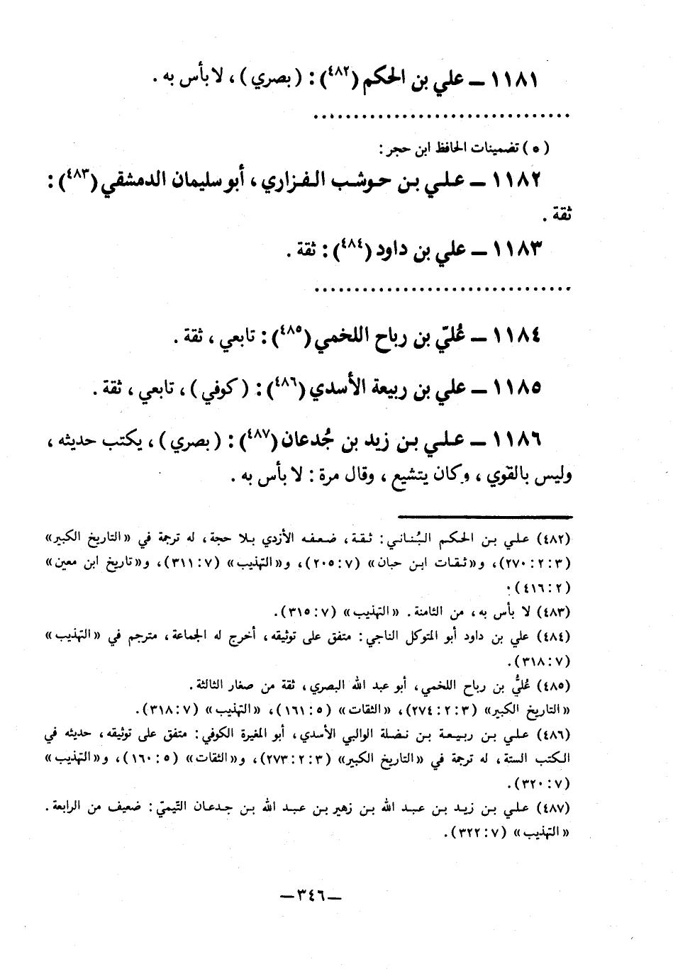 1186- علي بن زيد بن جدعان6: "بصري"، يكتب حديثه، وليس بالقوي، وكان يتشيع، وقال مرة: لا بأس به.