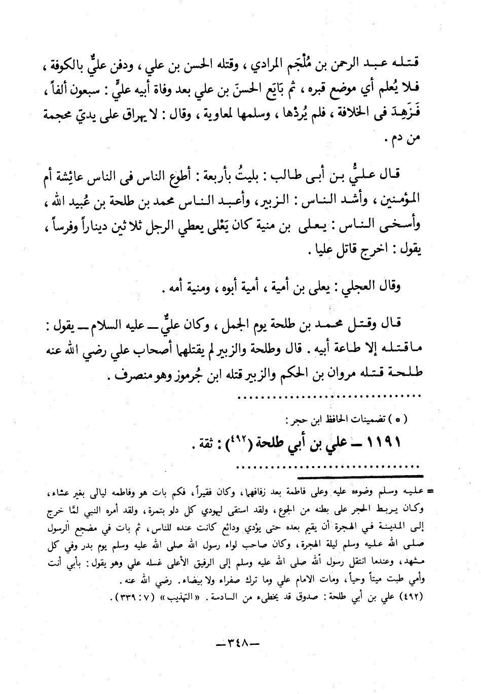 قال وقتل محمد بن طلحة يوم الجمل، وكان علي -عليه السلام- يقول: ما قتله إلا طاعة أبيه. قال وطلحة والزبير لم يقتلهما أصحاب علي رضي الله عنه طلحة قتله مروان بن الحكم والزبير قتله ابن جرموز وهو منصرف.