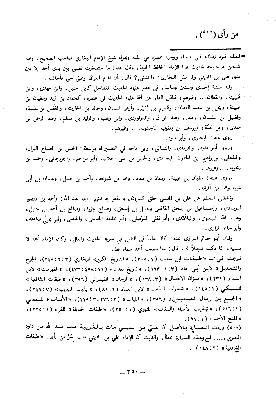1 وردت العبارة بالأصل أن علي بن المديني مات بالخُريبة عند عبد الله بن داود المقري ... إلخ وهذه العبارة خطأ، والثابت ان الإمام علي بن المديني مات بسر من رأي. "طبقات الشافعية" "2: 148".