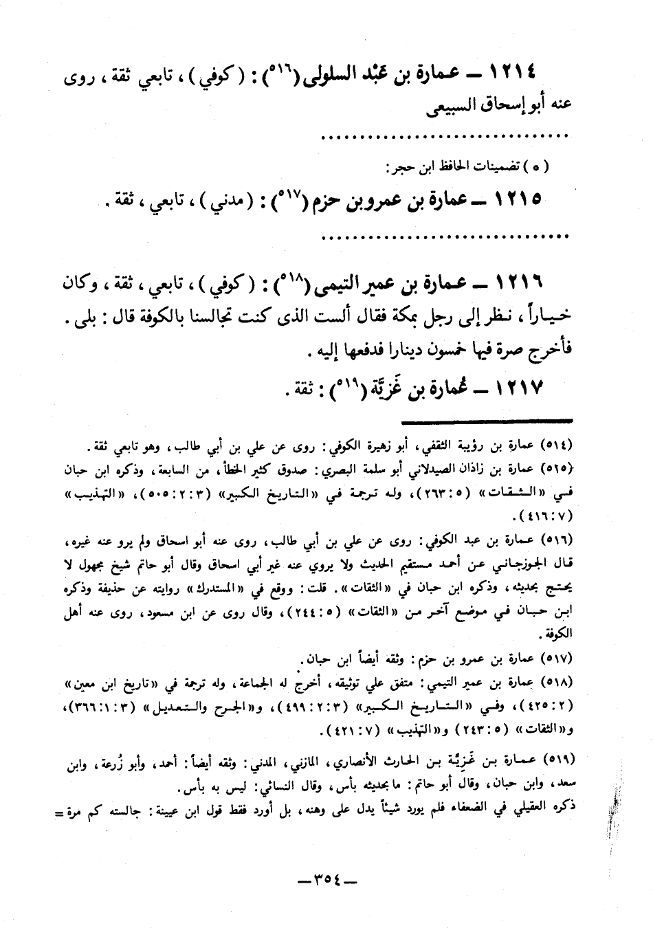 1216- عمارة بن عمير التيمي3: "كوفي"، تابعي، ثقة، وكان خيارًا، نظر إلى رجل بمكة فقال: ألست الذي كنت تجالسنا بالكوفة قال: بلى. فأخرج صرة فيها خمسون دينارًا فدفعها إليه.