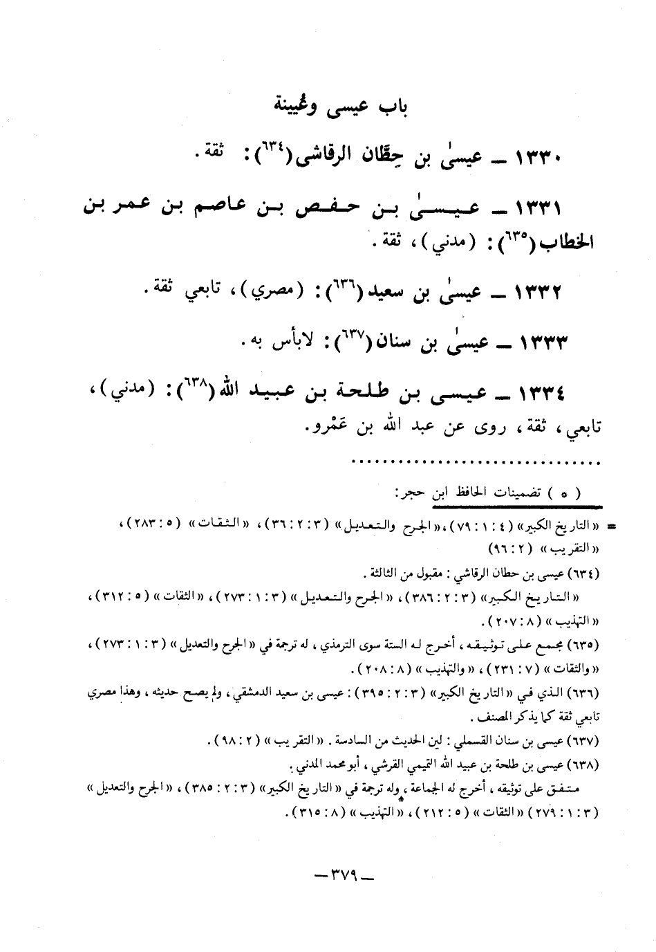 1334- عيسى بن طلحة بن عبيد الله5: "مدني"، تابعي، ثقة، روى عن عبد الله بن عمرو.