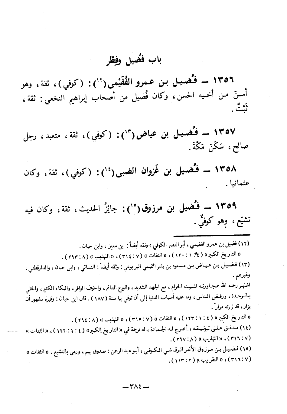 1356- فُضيل بن عمرو الفقيمي1: "كوفي"، ثقة، وهو أسن من أخيه الحسن، وكان فضيل من أصحاب إبراهيم النخعي: ثقة، ثبت.