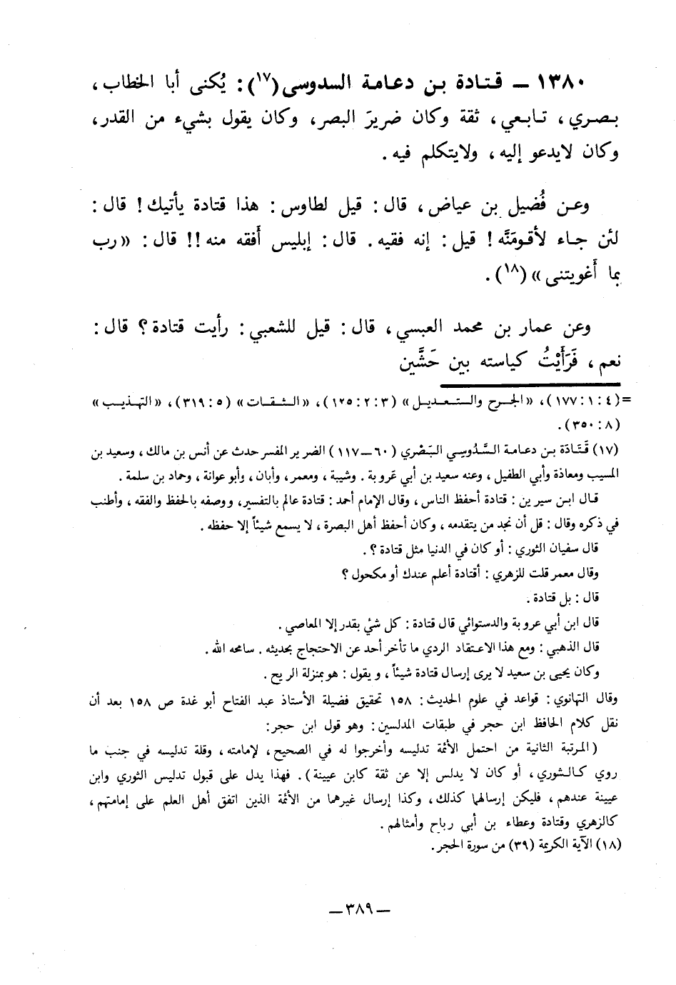 1380- قتادة بن دعامة السدوسي1: يكنى أبا الخطاب، بصري، تابعي، ثقة وكان ضرير البصر، وكان يقول بشيء من القدر، وكان لا يدعو إليه، ولا يتكلم فيه.