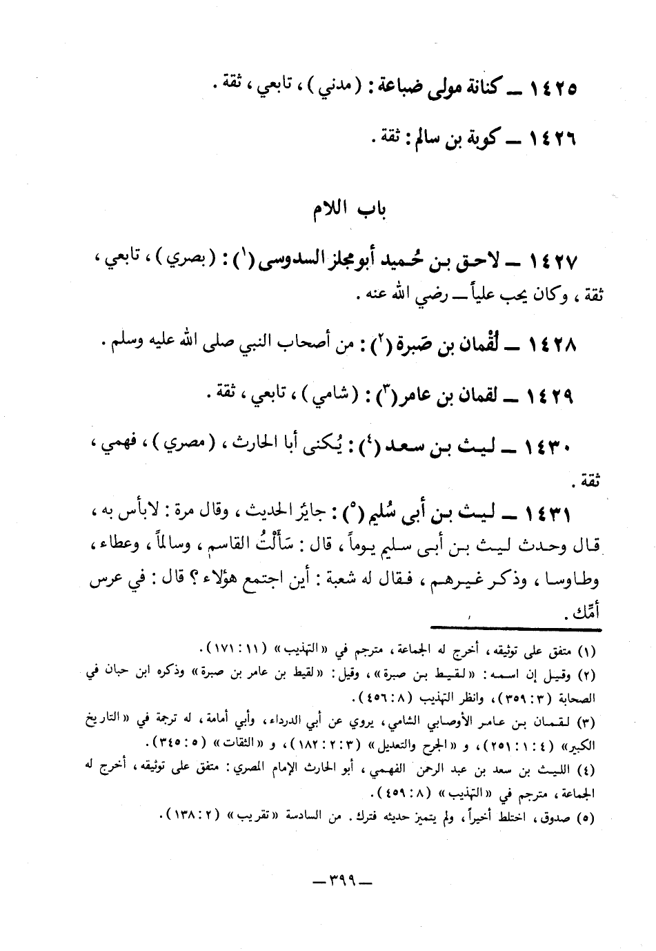 1430- ليث بن سعد4: يكنى أبا الحارث، "مصري"، فهمي، ثقة.
