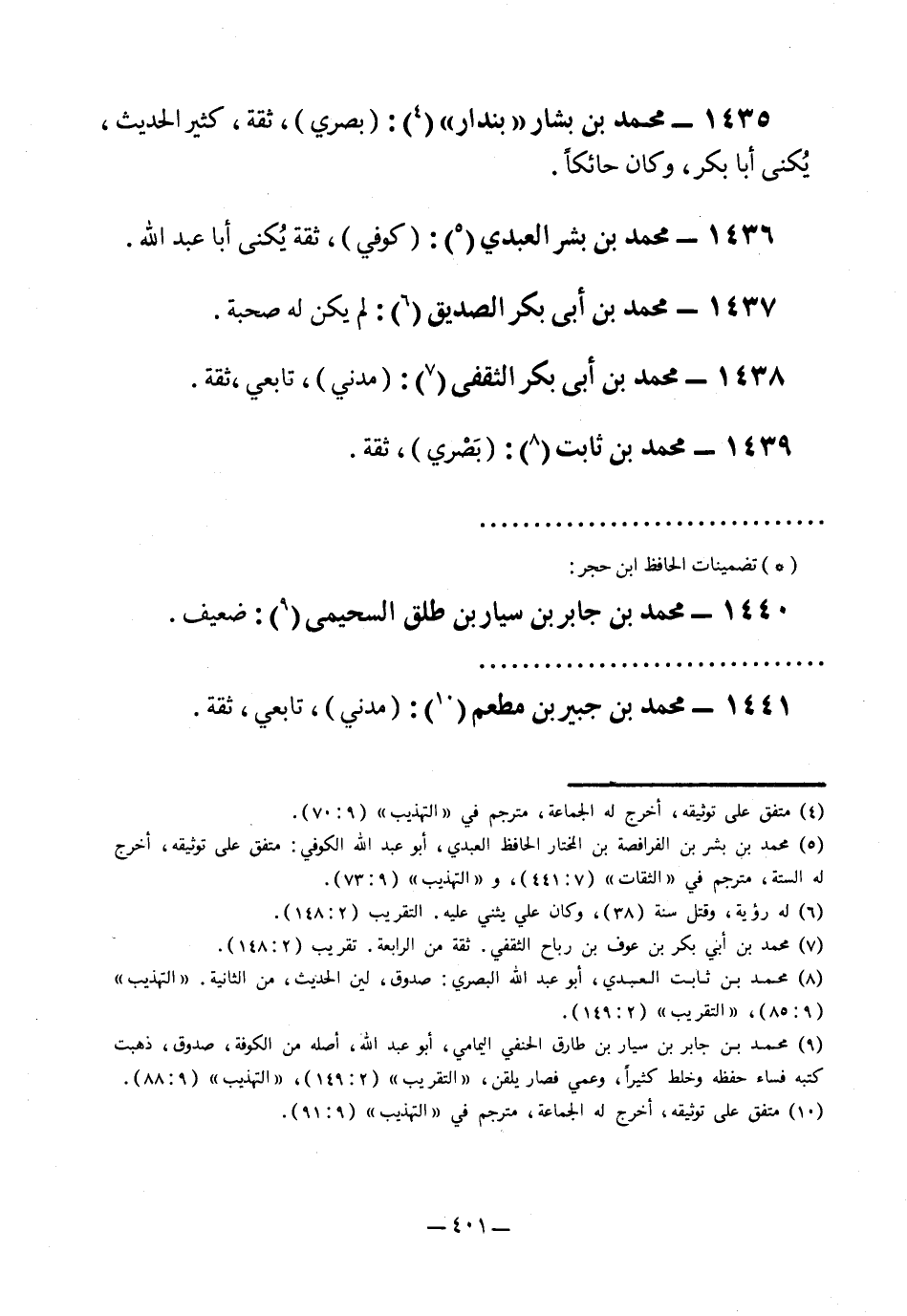 1435- محمد بن بشار "بندار"1: "بصري"، ثقة، كثير الحديث، يكنى أبا بكر، وكان حائكًا.