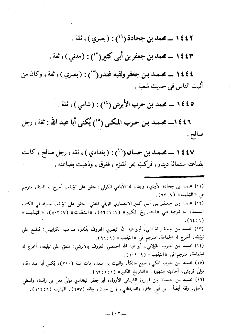 1444- محمد بن جعفر ولقبه غندر3: "بصري"، ثقة، وكان من أثبت الناس في حديث شعبة.