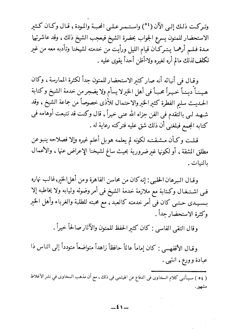 وتركت ذلك إلى الآن1, واستمر على المحبة والمودة، قال وكان كثير الاستحضار للمتون يسرع الجواب بحضرة الشيخ فيعجب الشيخ ذلك، وقد عاشرتهما مدة فلم أرهما يتركان قيام الليل ورأيت من خدمته لشيخنا وتأدبه معه من غير تكلف لذلك ما لم أره لغيره ولا أظن أحدًا يقوى عليه.