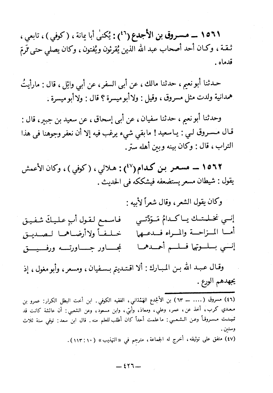 1561- مسروق بن الأجدع1: يكنى أبا يمانة، "كوفي"، تابعي، ثقة، وكان أحد أصحاب عبد الله الذين يقرئون ويفتون، وكان يصلي حتى ترم قدماه.