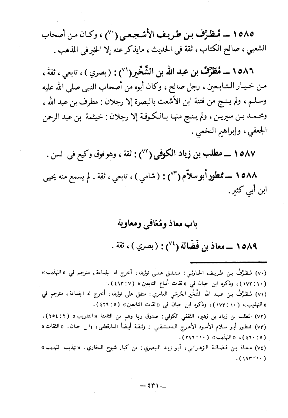 1586- مطرف بن عبد الله بن الشخير2: "بصري"، تابعي, ثقة، من خيار التابعين، رجل صالح، وكان أبوه من أصحاب النبي صلى الله عليه وسلم، ولم ينج من فتنة ابن الأشعث بالبصرة إلا رجلان: مطرف بن عبد الله، ومحمد بن سيرين، ولم ينج منها بالكوفة إلا رجلان: خيثمة بن عبد الرحمن الجعفي، وإبراهيم النخعي.