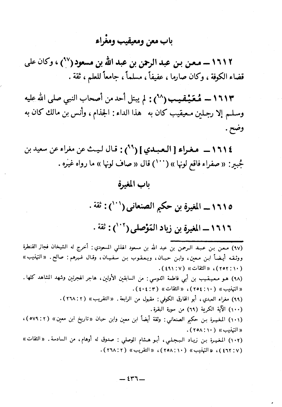 1612- معن بن عبد الرحمن بن عبد الله بن مسعود1، وكان على قضاء الكوفة، وكان صارمًا، عفيفًا، مسلمًا، جامعًا للعلم، ثقة.
