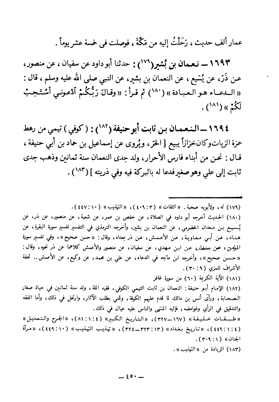 1694- النعمان بن ثابت أبو حنيفة4: "كوفي"، تيمي من رهط حمزة الزيات وكان خزازًا يبيع "الخز، ويُروى عن إسماعيل بن حماد بن أبي حنيفة، قال: نحن من أبناء فارس الأحرار، ولد جدي النعمان سنة ثمانين وذهب جدي ثابت إلى علي وهو صغير فدعا له بالبركة فيه وفي ذريته"5.