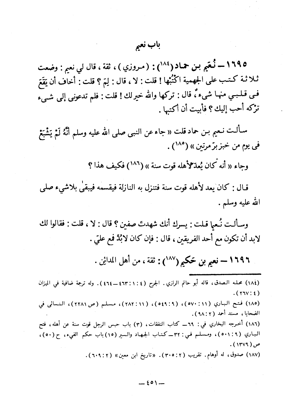 1695- نعيم بن حماد1: "مروزي"، ثقة، قال لي نعيم: وضعت ثلاث كتب على الجهمية اكتبها! قلت: لا، قال: لِمَ؟ قلت: أخاف أن يقع في قلبي منها شيء، قال: تركها والله خير لك! قلت: فلم تدعوني إلى شيء تركه أحب إليك؟ فأبيت أن أكتبها.