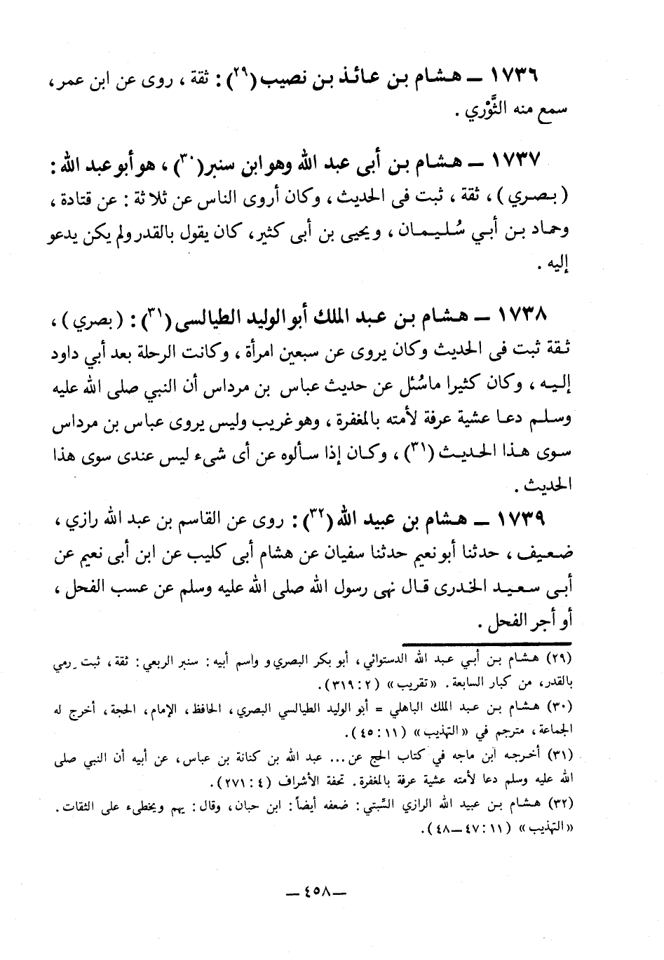 1737- هشام بن أبي عبد الله وهو ابن سنبر2، هو أبو عبد الله: "بصري"، ثقة، ثبت في الحديث، وكان أروى الناس عن ثلاثة: عن قتادة، وحماد بن أبي سليمان، ويحيى بن أبي كثير، كان يقول بالقدر ولم يكن يدعو إليه.