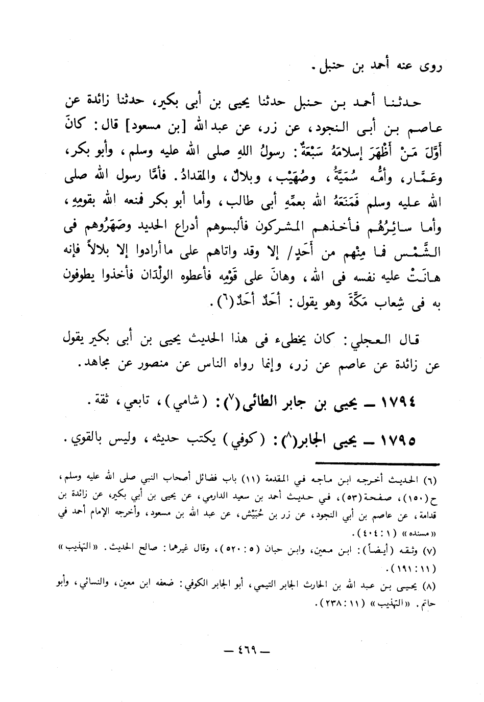 حدثنا أحمد بن حنبل حدثنا يحيى بن أبي بكير، حدثنا زائدة عن عاصم بن أبي النجود، عن زر، عن عبد الله "بن مسعود" قال: كان أول من أظهر إسلامه سبعة: رسول الله صلى الله عليه وسلم، وأبو بكر، وعمار، وأمه سمية، وصهيب، وبلال، والمقداد، فأما رسول الله صلى الله عليه وسلم فمنعه الله بعمه أبي طالب، وأما أبو بكر فمنعه الله بقومه، وأما سائرهم فأخذهم المشركون فألبسوهم أدراع الحديد وصهروهم في الشمس فما منهم من أحد إلا وقد واتاهم على ما أرادوا إلا بلالا فإنه هانت عليه نفسه في الله، وهان على قومه فأعطوه الولدان فأخذوا يطوفون به في شعاب مكة وهو يقول: أحد أحد1.