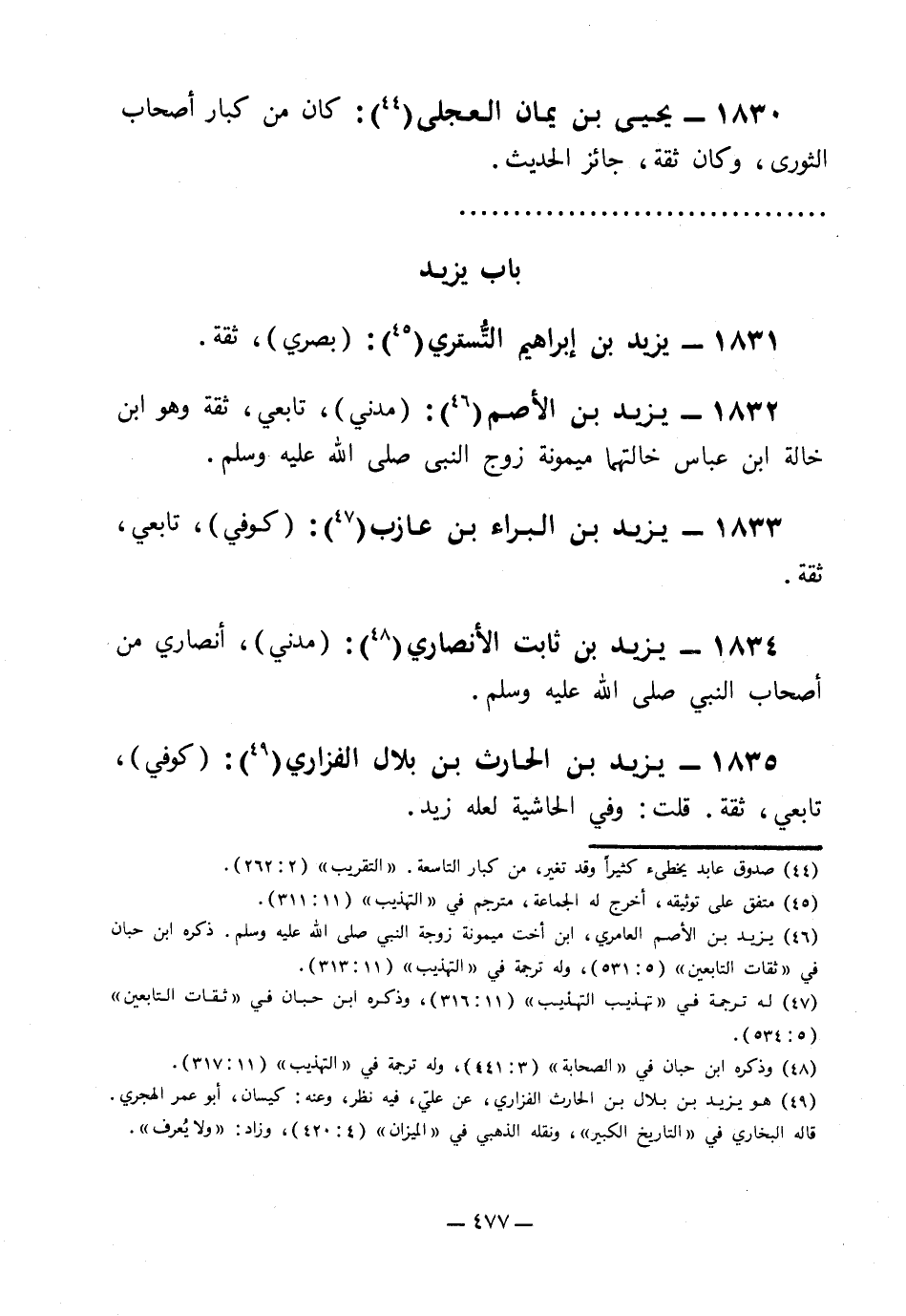 1835- يزيد بن الحارث بن بلال الفزاري6: "كوفي"، تابعي، ثقة. قلت: وفي الحاشية لعله زيد.