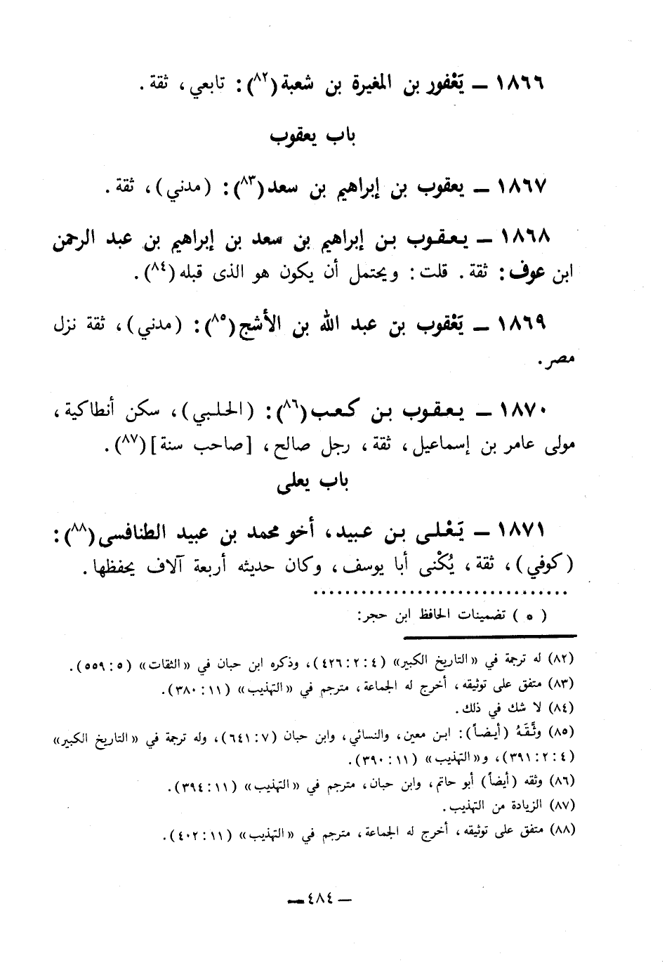 1871- يعلى بن عبيد، أخو محمد بن عبيد الطنافسي7: "كوفي، ثقة، يكنى أبا يوسف، وكان حديثه أربعة آلاف يحفظها.