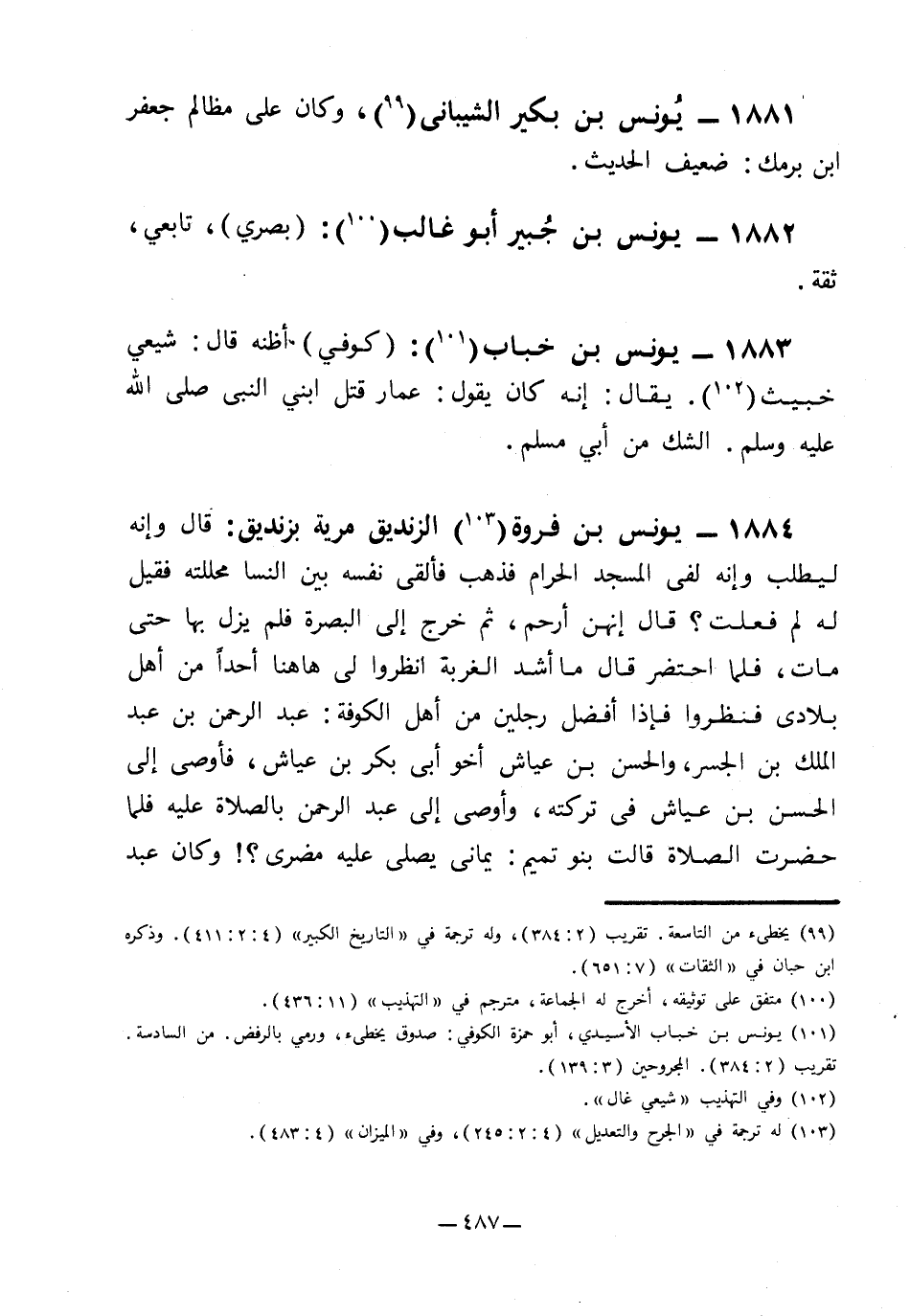 1883- يونس بن خباب3: "كوفي"، أظنه قال: شيعي خبيث4. يقال: إنه كان يقول: عمار قتل ابني النبي صلى الله عليه وسلم. الشك من أبي مسلم.