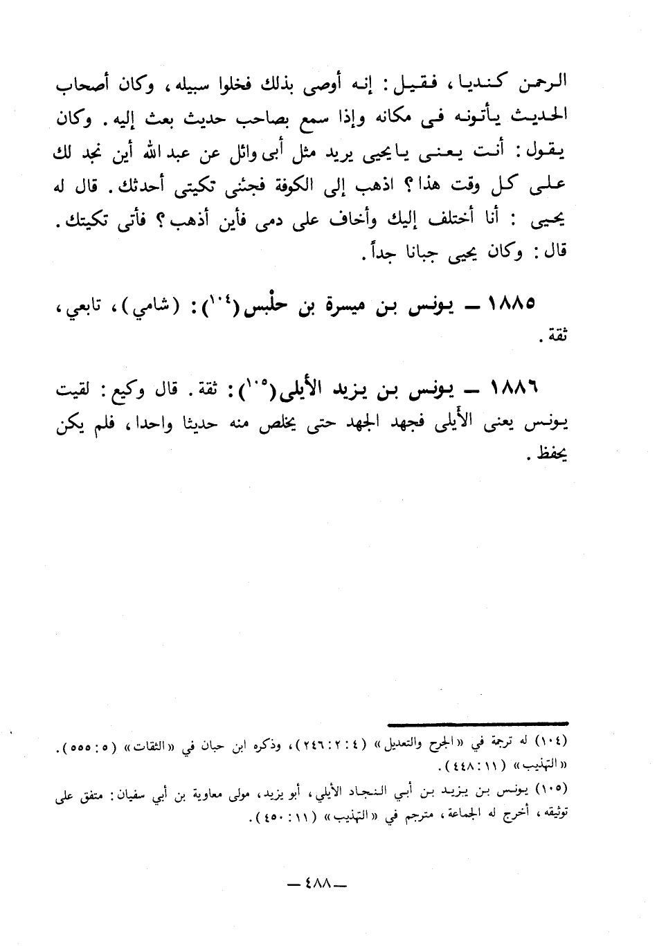 1886- يونس بن يزيد الأيلي2: ثقة. قال وكيع: لقيت يونس يعني الأيلي فجهد الجهد حتى يخلص منه حديثًا واحدًا، فلم يكن يحفظ.