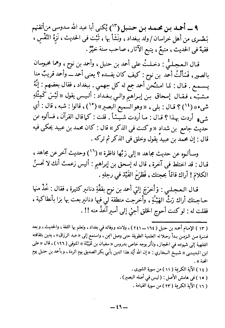 9- أحمد بن محمد بن حنبل1 يكنى أبا عبد الله سدوسي من أتقنهم بصري من أهل خراسان, ولد ببغداد، ونشأ بها، ثبت في الحديث، نَزِه النفس، فقيه في الحديث، متبعٌ، يتبع الآثار، صاحب سنة خيّرٌ.