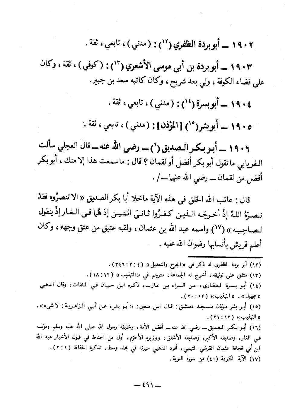 1906- أبو بكر الصديق5 -رضي الله عنه- قال العجلي: سألت الفريابي ما تقول أبو بكر أفضل أو لقمان؟ قال: ما سمعت هذا إلا منك، أبو بكر أفضل من لقمان -رضي الله عنهما.