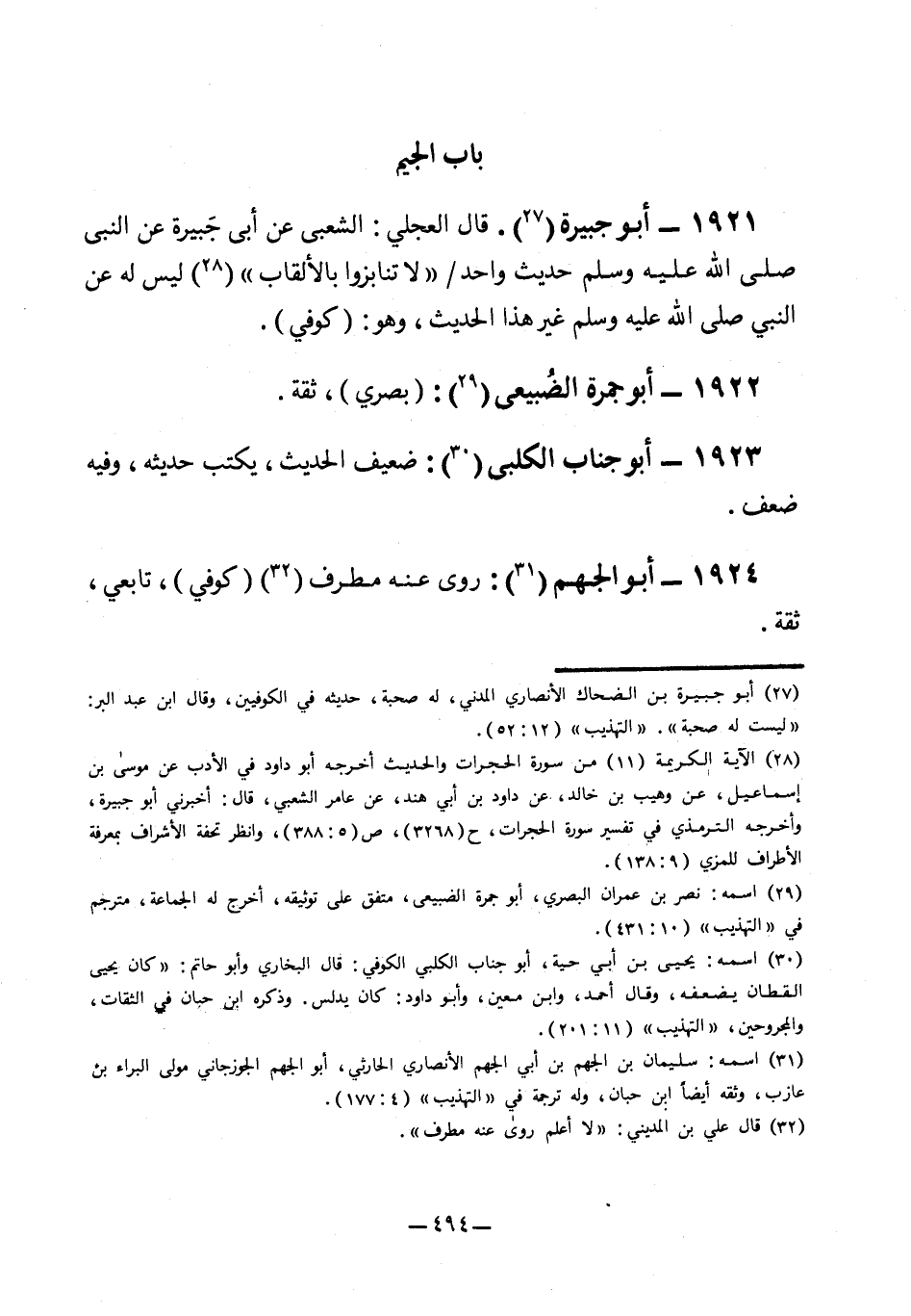 1921- أبو جبيرة1. قال العجلي: الشعبي عن أبي جبيرة عن النبي صلى الله عليه وسلم حديث واحد {وَلَا تَنَابَزُوا بِالْأَلْقَابِ} 2 ليس له عن النبي صلى الله عليه وسلم غير هذا الحديث، وهو: "كوفي".