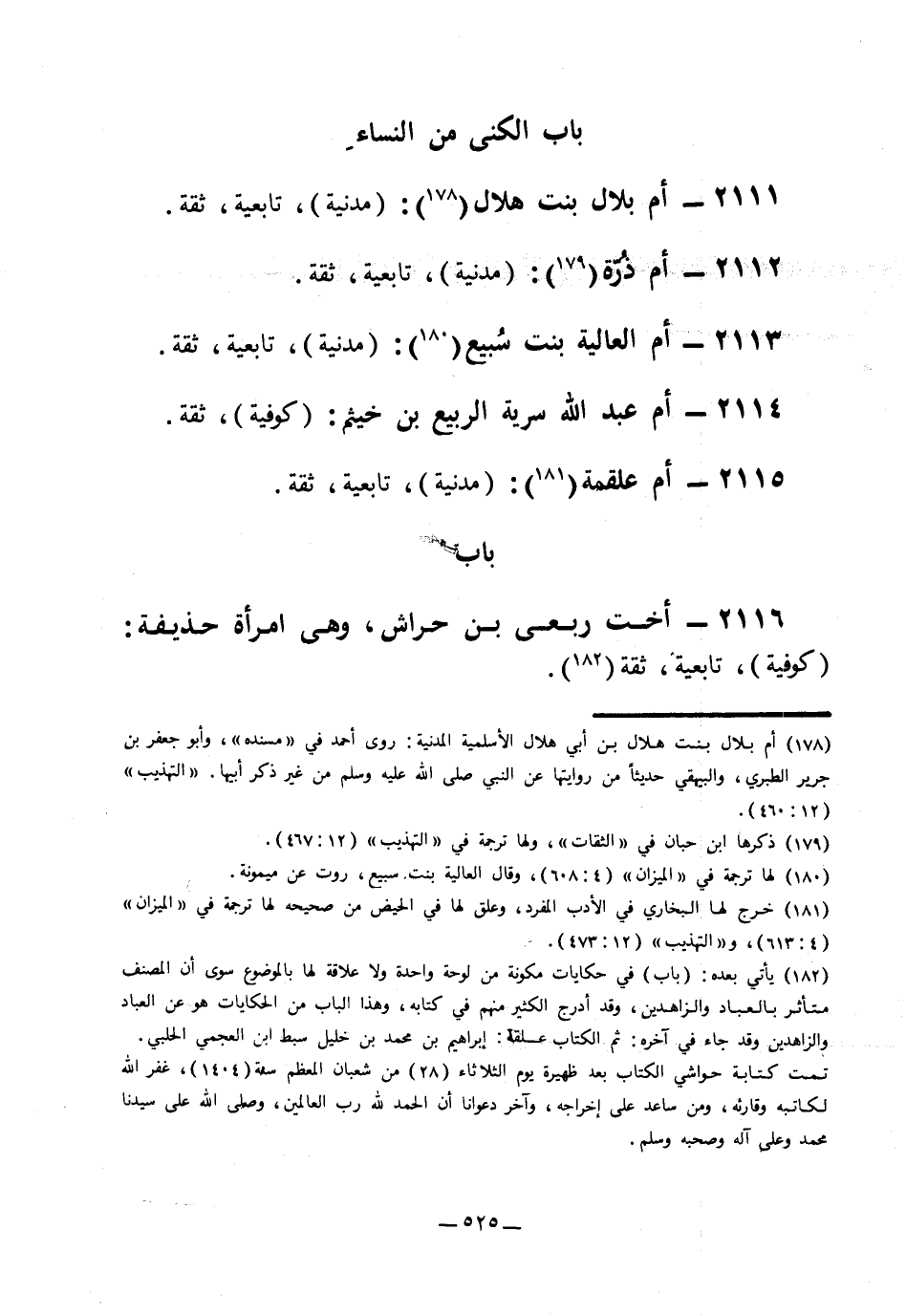 2116- أخت ربعي بن حراش، وهي امرأة حذيفة: "كوفية"، تابعية، ثقة5.