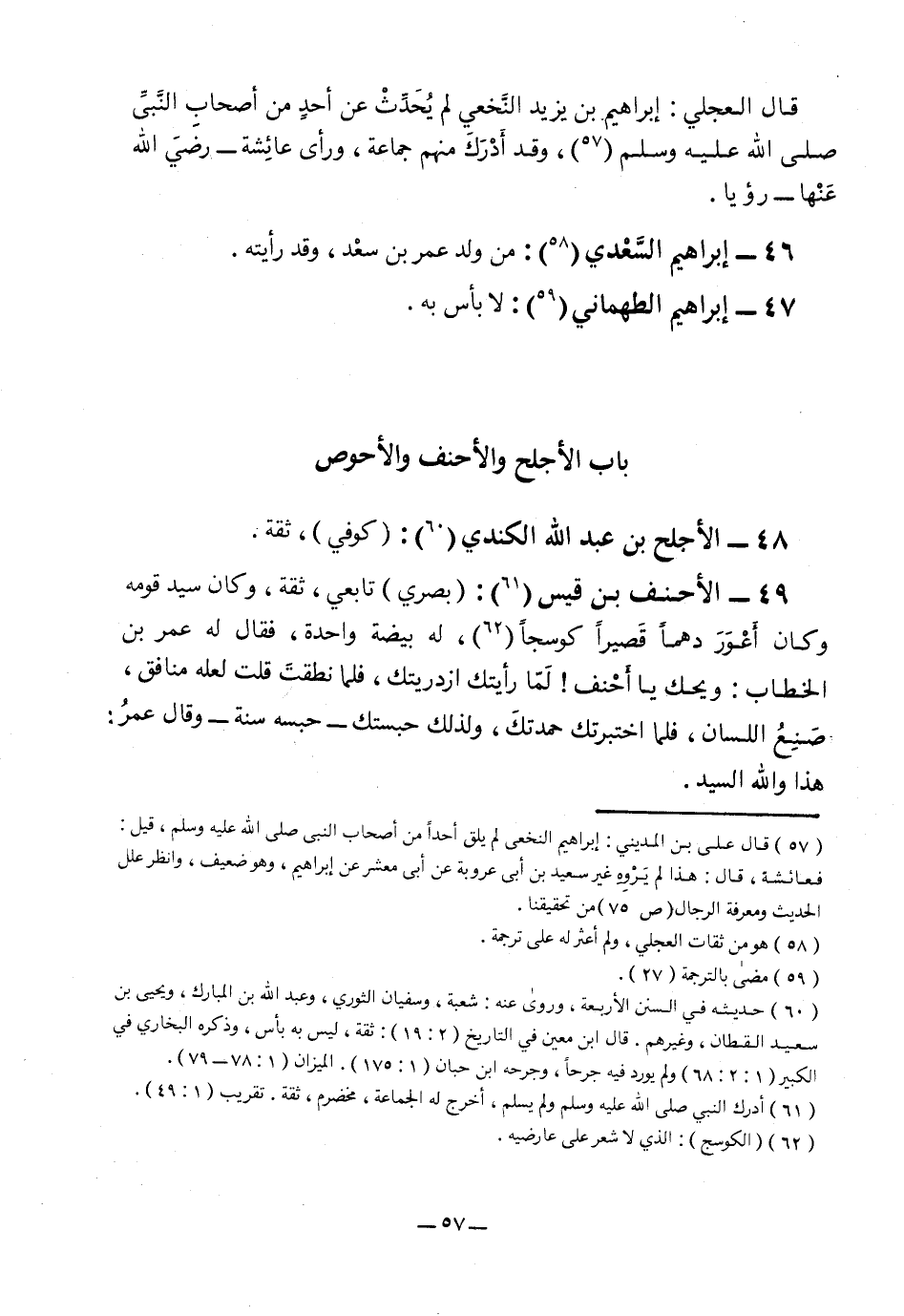 49- الأحنف بن قيس5: "بصري" تابعي، ثقة، وكان سيد قومه وكان أعور دهمًا قصيرًا كوسجًا6، له بيضة واحدة، فقال له عمر بن الخطاب، ويحك يا أحنف! لما رأيتك ازدريتك، فلما نطقت, قلت: لعله منافق، صنيعُ اللسان، فلما اختبرتك حمدتك، ولذلك حبستك -حبسه سنة- وقال عمرُ: هذا والله السيد.