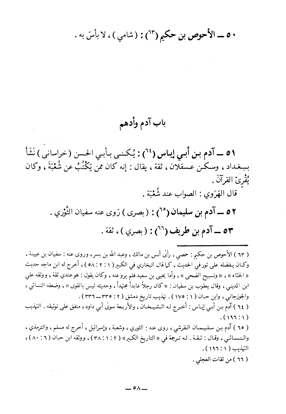 51- آدم بن أبي إياس2: يُكنى بأبي الحسن "خراساني" نشأ ببغداد، وسكن عسقلان، ثقة، يقال: إنه كان ممن يكتب عن شعبة، وكان يقرئ القرآن.
