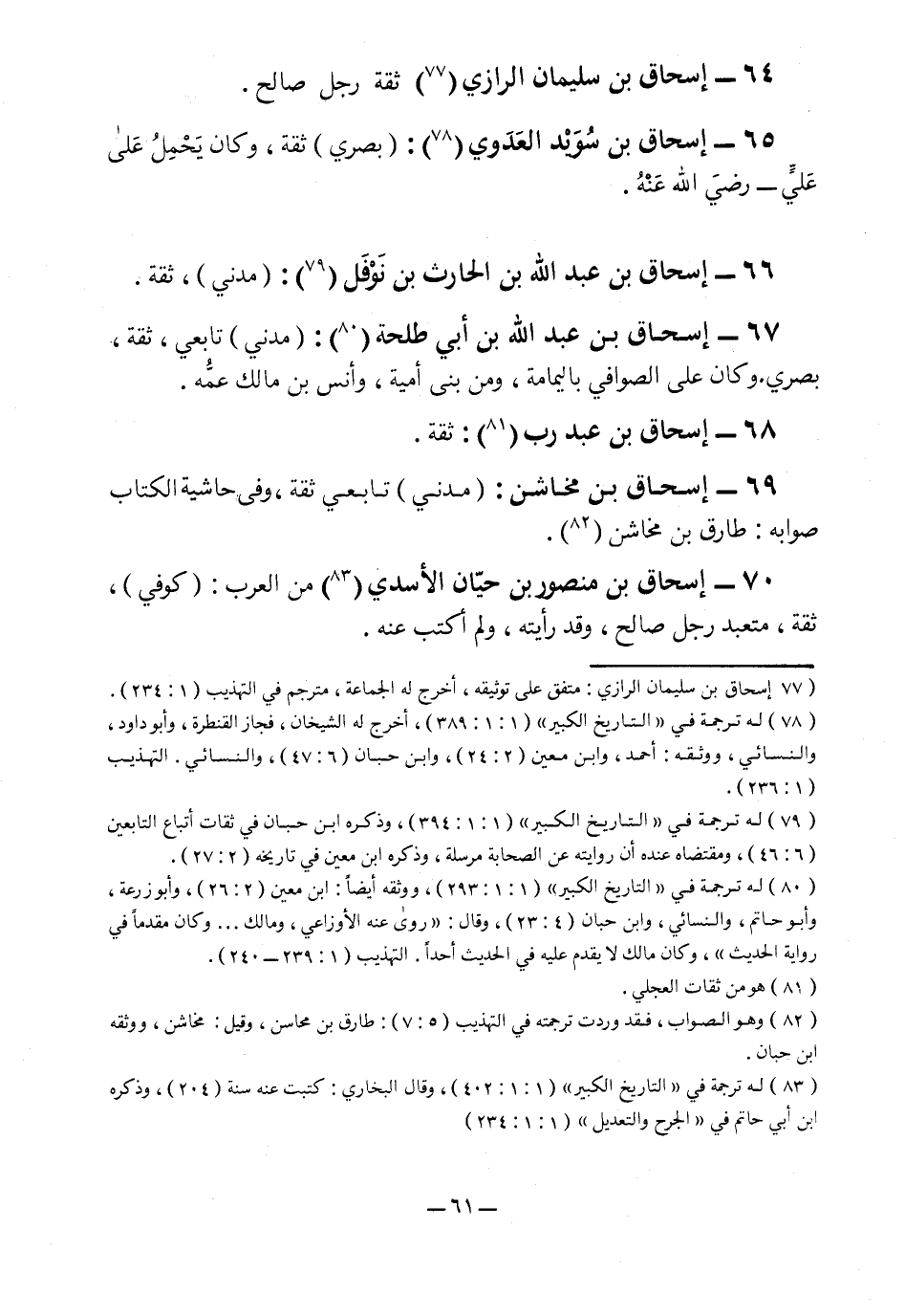 70- إسحاق بن منصور حيان الأسدي7 من العرب: "كوفي"، ثقة، متعبد رجل صالح، وقد رأيته، ولم أكتب عنه.