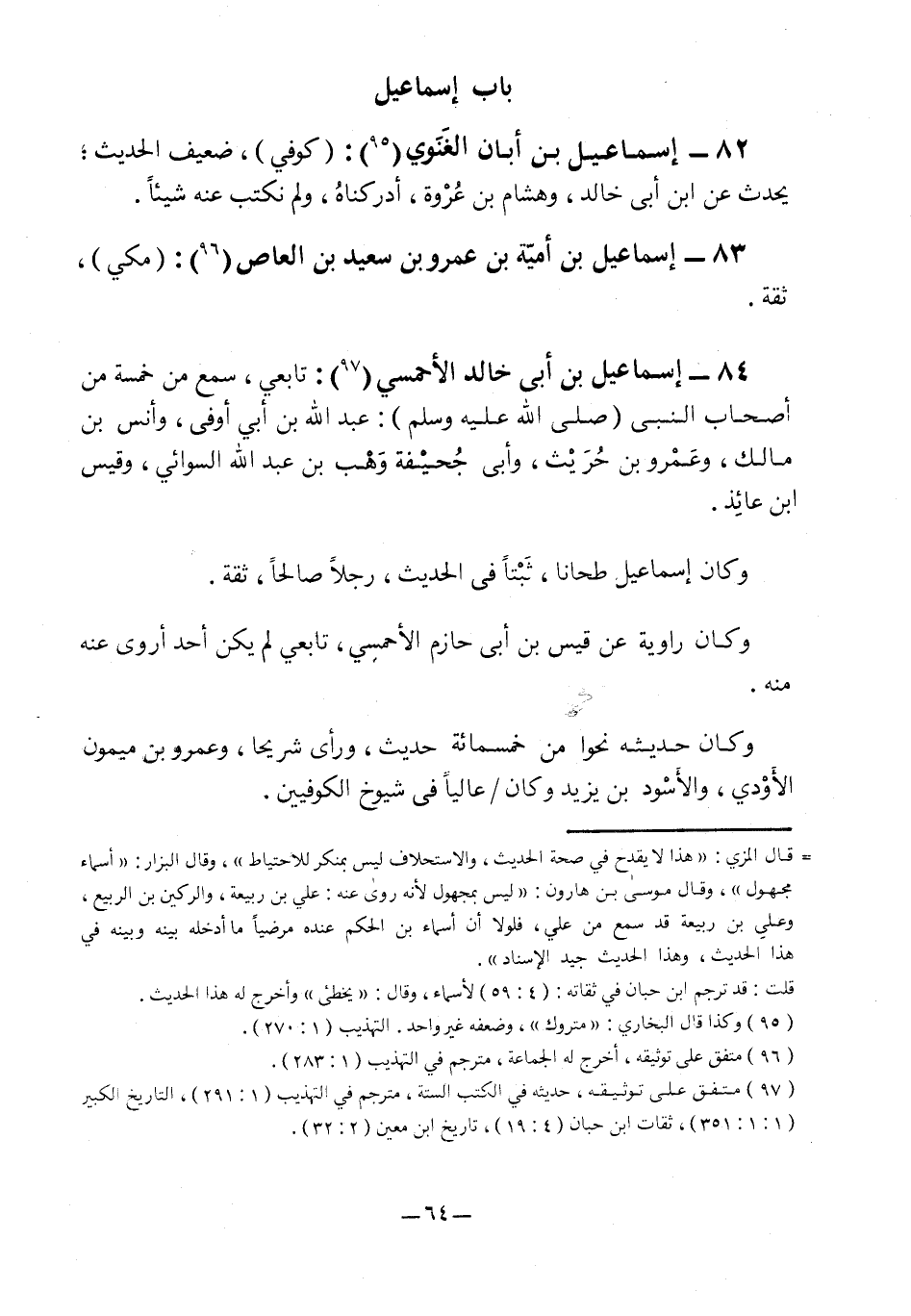 84- إسماعيل بن أبي خالد الأحمسي3: تابعي، سمع من خمسة من أصحاب النبي صلى الله عليه وسلم: عبد الله بن أبي أوفى، وأنس بن مالك، وعمرو بن حريث، وأبي جحيفة وهب بن عبد الله السوائي، وقيس بن عائذ.