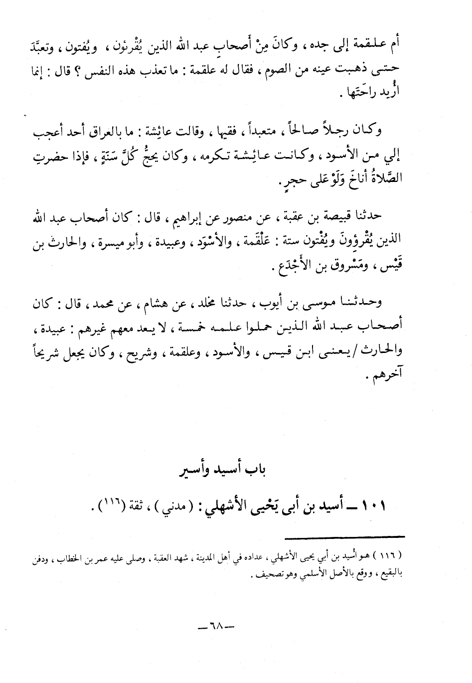 حدثنا قبيصة عن عقبة، عن منصور عن إبراهيم، قال: كان أصحاب عبد الله الذين يُقرؤون ويفتون ستة: علقمة، والأسود، وعبيدة، وأبو ميسرة، والحارث بن قيس، ومسروق بن الأجدع.