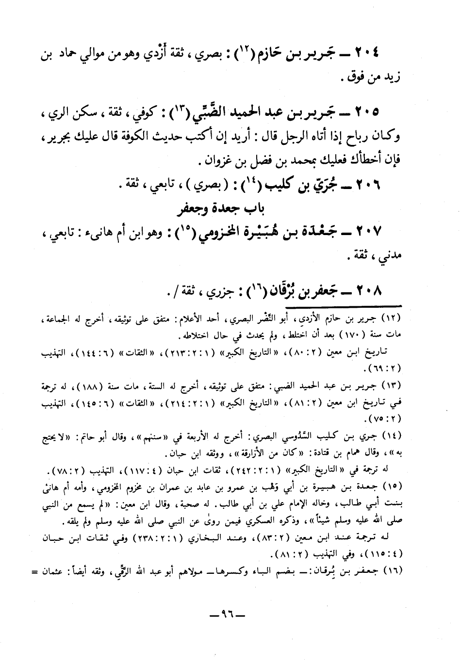 205- جرير بن عبد الحميد الضبي2: كوفي، ثقة، سكن الري، وكان رباح إذا أتاه الرجل قال: أريد أن أكتب حديث الكوفة قال: عليك بجرير، فإن أخطأك فعليك بمحمد بن فضل بن غزوان.