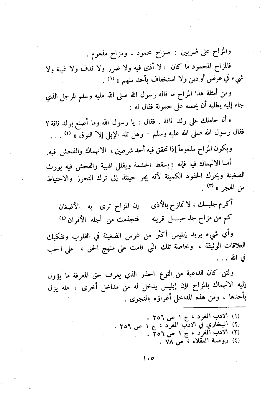 فالمزاح المحمود ما كان" لا أذى فيه ولا ضرر ولا قذف ولا غيبة ولا شيء في عرض أو دين ولا استخفاف بأحد منهم"