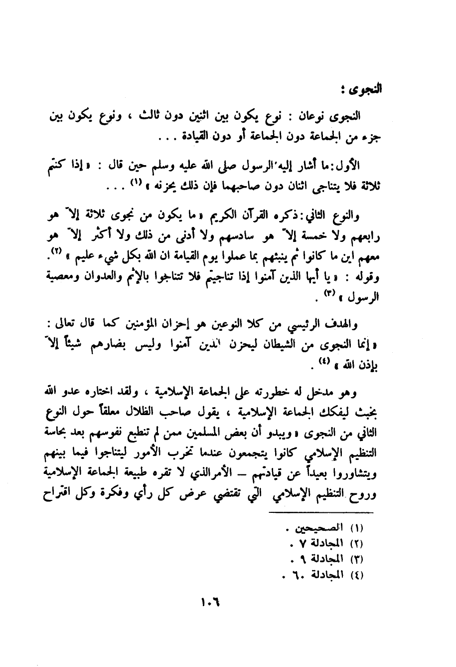 النجوى نوعان: نوع يكون بين اثنين دون ثالث ونوع يكون بين جزء من الجماعة دون الجماعة او دون القيادة