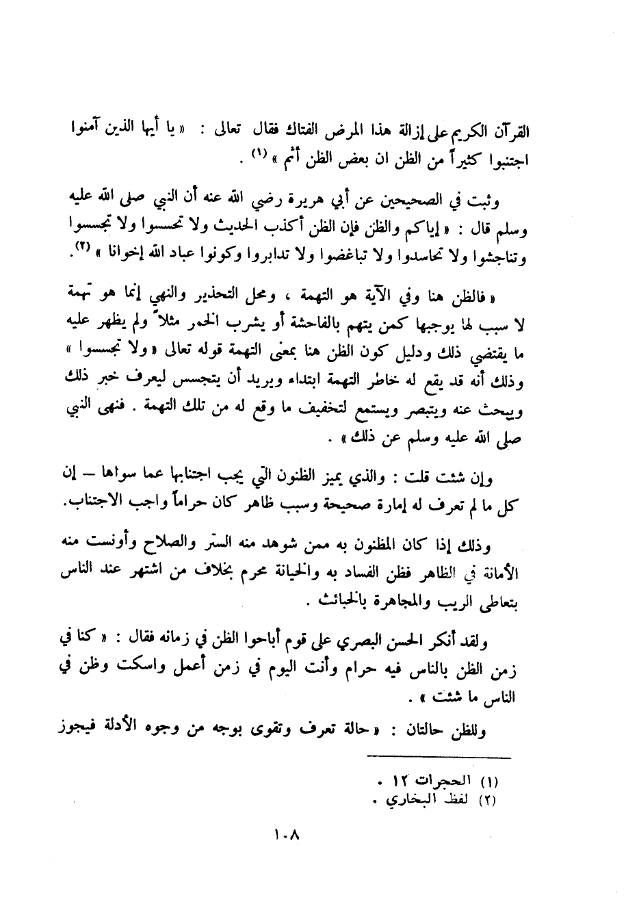 ولقد أنكر الحسن البصري على قوم أباحوا الظن في زمانه فقال:" كنا في زمن الظن بالناس فيه حرام وانت اليوم في زمن أعمل واسكت وظن في الناس ما شئت".