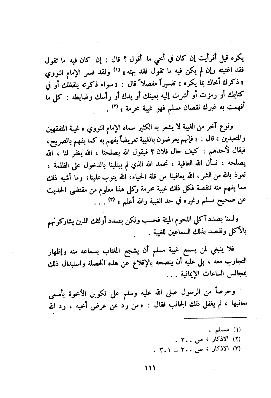 ونوع آخر من الغيبة لا يشعر به الكثير سماه الامام النووي" غيبة المتفقهين والمتعبدين" قال:" فانهم يعرضون بالغيبة تعريضا يفهم به كما يفهم بالصريح فيقال لأحدهم: كيف حال فلان؟ فيقول الله يصلحنا الله يغفر لنا الله يصلحه نسأل الله العافية نحمد الله الذي لم يبتلينا بالدخول على الظلمة نعوذ بالله من الشر الله يعافينا من قلة الحياء الله يتوب علينا وما اشبه ذلك مما يفهم منه تنقصة فكل ذلك غيبة محرمة وكل هذا معلوم من مقتضى الحديث عن صحيح مسلم وغيره في حد الغيبة والله اعلم" ...
