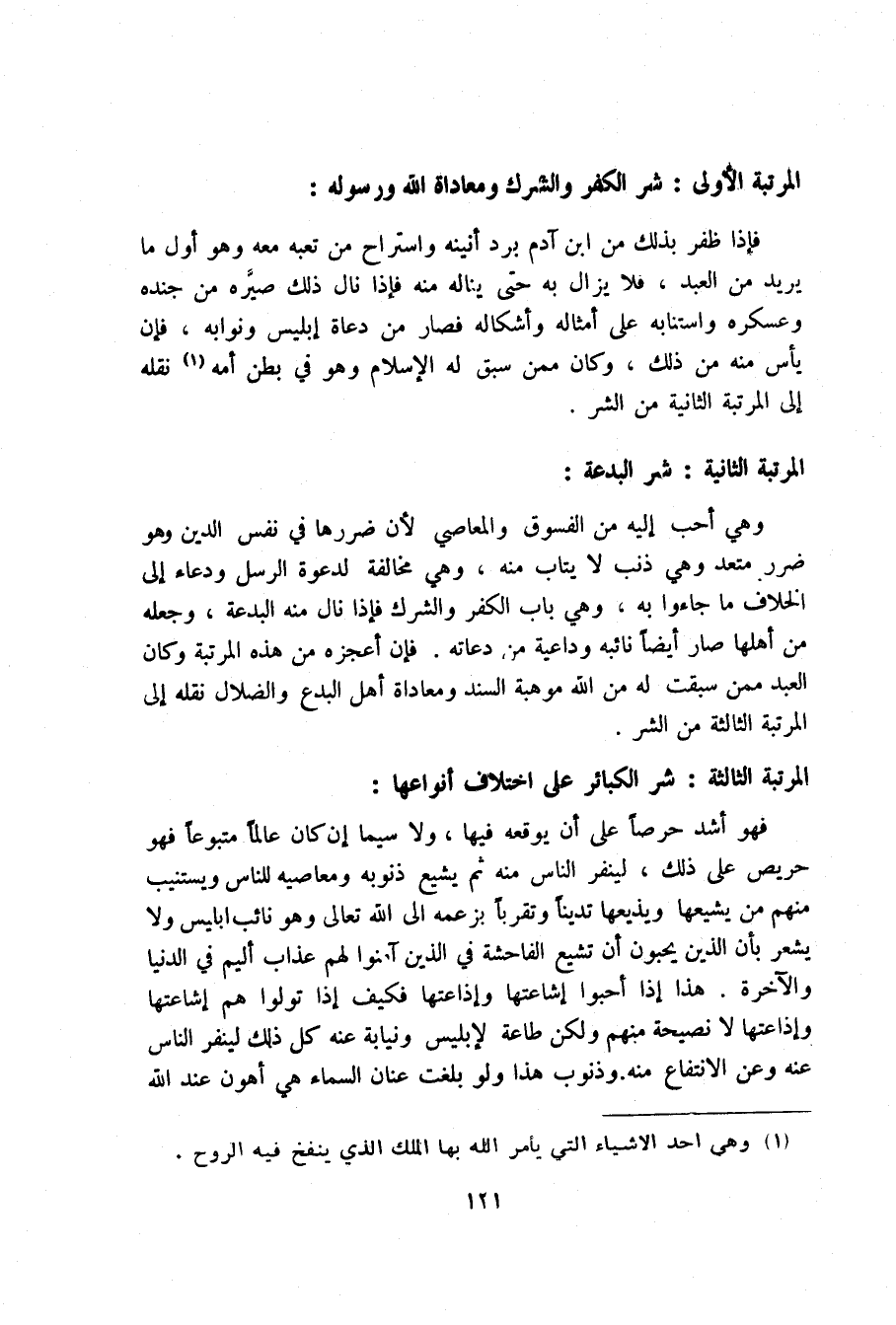 فإذا ظفر بذلك من ابن آدم برد أنينه واستراح من تعبه معه وهو أول ما يريد من العبد، فلا يزال به حتى يناله منه فإذا نال ذلك صيّره من جنده وعسكره واستنابه على أمثاله وأشكاله فصار من دعاة إبليس ونوابه، فان يأس منه من ذلك وكان ممن سبق له الاسلام وهو في بطن امه نقله الى المرتبة الثانية من الشر.