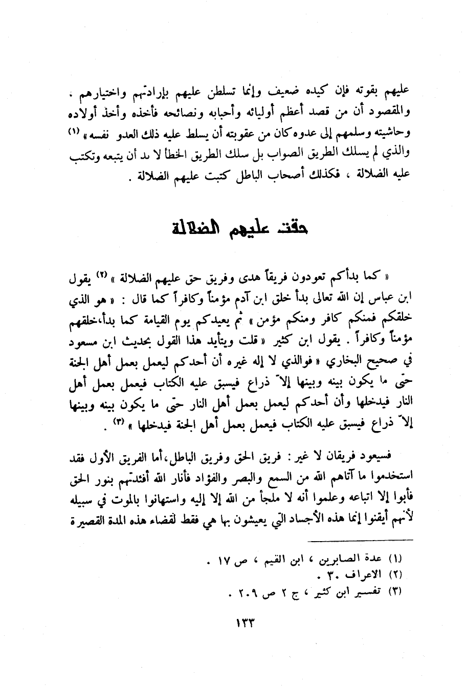 " كما بدأكم تعودون فريقا هدى وفريق حق عليهم الضلالة " يقول ابن عباس ان الله تعالى بدأ خلق ابن آدم مؤمنا وكافرا كما قال:" هو الذي خلقكم فمنكم كافر ومنكم مؤمن " ثم يعيدكم يوم القيامة كما بدأ خلقهم مؤمنا وكافرا. يقول ابن كثير" قلت ويتأيد هذا القول بحديث ابن مسعود في صحيح البخاري" فوالذي لا اله غيره أن أحدكم ليعمل بعمل اهل الجنة حتى ما يكون بينه وبينها الا ذراع فيسبق عليه الكتاب فيعمل بعمل اهل النار فيدخلها وان احدكم ليعمل بعمل اهل النار حتى ما يكون بينه وبينها الا ذراع فيسبق عليه الكتاب فيعمل بعمل اهل الجنة فيدخلها".