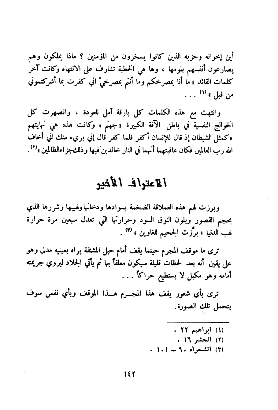 وانتهت مع هذه الكلمات كل بارقة أمل للعودة وانصهرت كل الحوائج النفسية في باطن الآفة الكبيرة"جهنم" وكانت هذه هي نهايتهم" كمثل الشيطان اذ قال للانسان أكفر فلما كفر قال اني بريء منك اني اخاف الله رب العالمين فكان عاقبتهما انهما في النار خالدين فيها وذلك جزاء الظالمين"