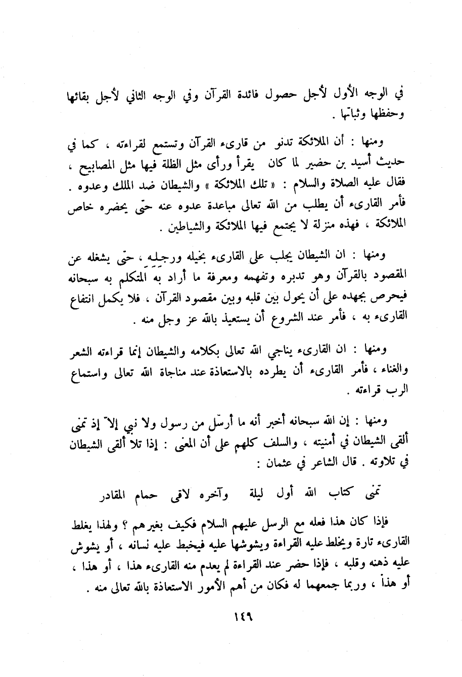 ومنها: ان الملائكة تدنو من قاريء القرآن وتستمع لقراءته كما في حديث اسيد بن حضير لما كان يقرأ ورأى مثل الظلة فيها مثل المصابيح فقال عليه الصلاة والسلام:"تلك الملائكة" والشيطان ضد الملك وعدوه فامر القاريء ان يطلب من الله تعالى مباعدة عدوه عنه حتى يحضره خاص الملائكة فهذه منزلة لا يجتمع فيها الملائكة والشياطين.