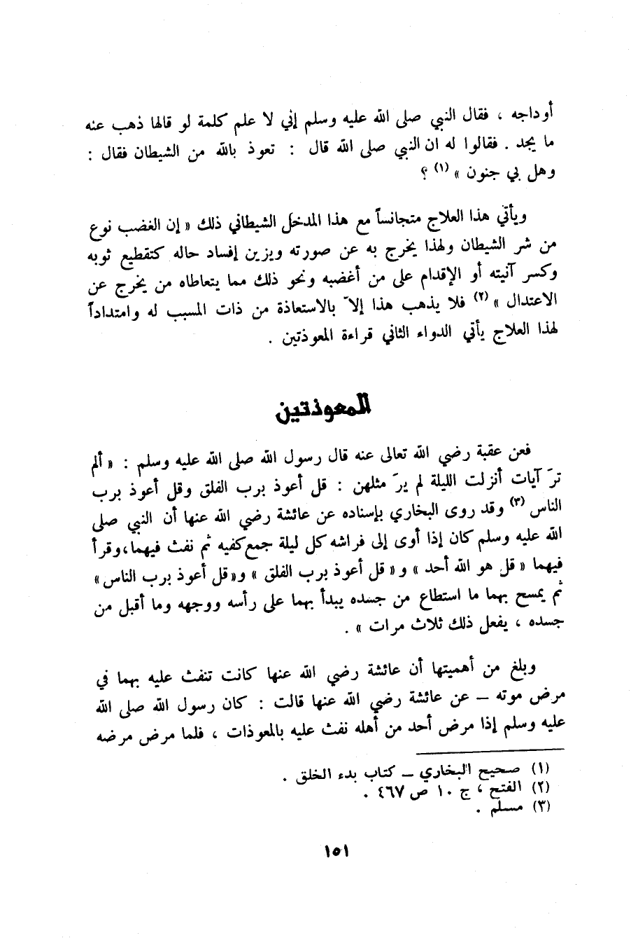 فعن عقبة رضي الله تعالى عنه قال رسول الله صلى الله عليه وسلم:"ألم تر آيات أنزلت الليلة لم ير مثلهن: قل أعوذ برب الفلق وقل اعوذ برب الناس وقد روى البخاري باسناده عن عائشة رضي الله عنها ان النبي صلى الله عليه وسلم كان اذا أوى الى فراشه كل ليلة جمع كفيه ثم نفث فيهما وقرأ فيهما" قل هو الله أحد " وقل أعوذ برب الفلق" وقل أعوذ برب الناس" ثم يمسح بهما ما استطاع من جسده يبدأ بهما على رأسه ووجهه وما أقبل من جسده يفعل ذلك ثلاث مرات"