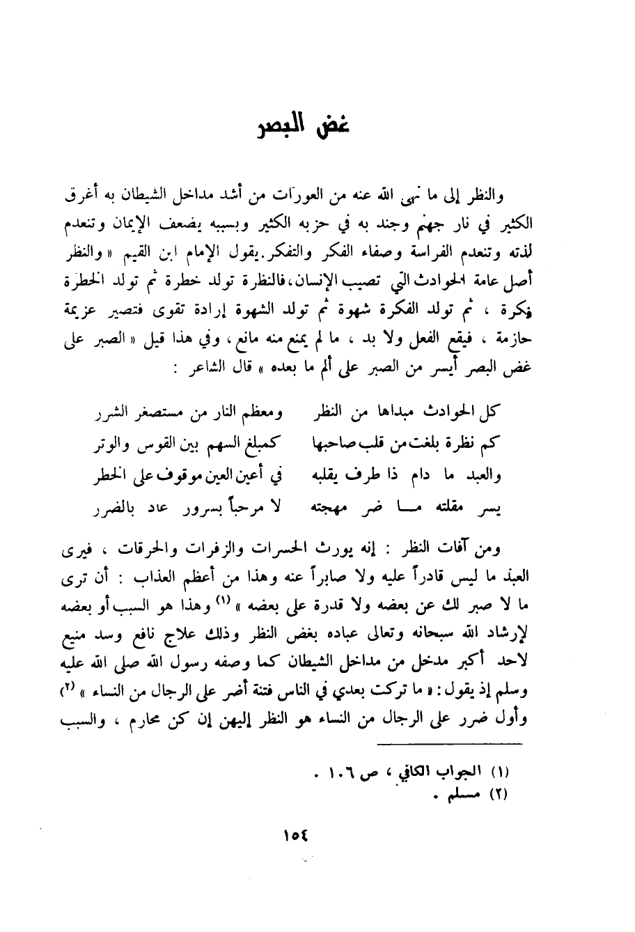 ومن آفات النظر: انه يورث الحسرات والزفرات والحرقات فيرى العبد ما ليس قادرا عليه ولا صابرا عنه وهذا اعظم العذاب: ان ترى ما لا صبر لك عن بعضه ولا قدرة على بعضه وهذا هو السبب او بعضه لارشاد الله سبحانه وتعالى عباده بغض النظر وذلك علاج نافع وسد منيع لاحد اكبر مدخل من مداخل الشيطان كما وصفه رسول الله صلى الله عليه وسلم اذ يقول:" ما تركت بعدي في الناس فتنة اضر على الرجال من النساء"