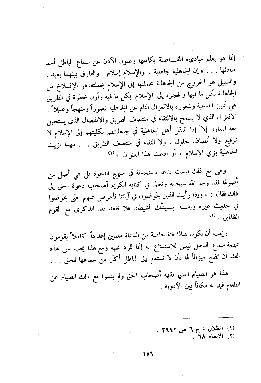 " ان الجاهلية جاهلية والاسلام اسلام والفارق بينهما بعيد. والسبيل هو الخروج من الجاهلية بجملتها الى الاسلام بجملته هو الانسلاخ من الجاهلية بكل ما فيها والهجرة الى الاسلام بكل ما فيه واول خطوة في الطريق هي تمييز الداعية وشعوره بالانعزال التام عن الجاهلية تصورا ومنهجا وعملا.